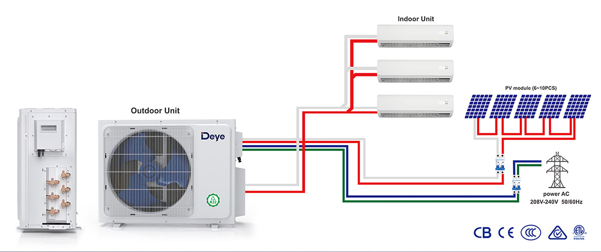 - Den Deye Solar Multi Split System bruker hybrid ACDC-drift teknologi, noe som betyr at den ikke bare er avhengig av solenergi.